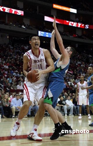 當(dāng)?shù)貢r間2月7日晚,休斯敦火箭在主場豐田中心迎戰(zhàn)西北賽區(qū)倒數(shù)第二的森林狼隊。結(jié)果火箭在上半場一度落后兩位數(shù),但憑借姚明和阿爾斯通等人在下半場的出色發(fā)揮,火箭最終以107-90擊敗森林狼避免了尷尬的連敗。姚明全場18次投籃12次命中,得到火箭最高的30分6個籃板5次蓋帽。中新社發(fā) 歐文 攝