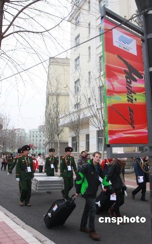 2月12日,黑龍江哈爾濱市,來此參加大冬會的德國代表團成員進入大冬會運動員村。當日,第24屆世界大學(xué)生冬季運動會黑龍江大學(xué)運動員村迎來首批客人。中新社發(fā) 王忠言 攝