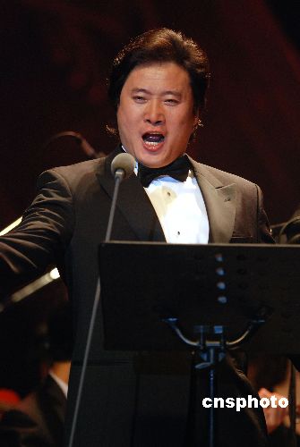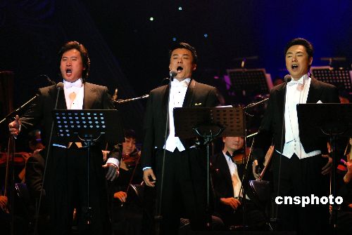 10月24日晚,華人三大男高音丁毅、范競(jìng)馬、戴玉強(qiáng)在北京傾情高歌,由此,《我們的奧運(yùn)》之“全球華人三大男高音”世界巡演音樂(lè)會(huì)正式啟動(dòng)。當(dāng)晚,三人除了演唱西洋經(jīng)典歌劇選段《今夜無(wú)人入睡》、《重歸蘇蓮?fù)小返韧,還演唱了多首中國(guó)民歌和祝福奧運(yùn)的《北京頌歌》。承辦方華視嘉禾介紹說(shuō),“三高”此次巡演是代表全球華人藝術(shù)家向北京2008年奧運(yùn)會(huì)獻(xiàn)上的一份祝福,也是表達(dá)對(duì)不久前去世的世界著名男高音歌唱家帕瓦羅蒂的緬懷。不久前,丁毅、范競(jìng)馬、戴玉強(qiáng)已通過(guò)工商局注冊(cè)為“華人·三高”的品牌。至此,中國(guó)聲樂(lè)界也有了“三高”。他們表示,“三高”的提法并非指“中國(guó)最頂尖的三大男高音”,而只是眾多優(yōu)秀男高音之中具有代表性的三位。中新社發(fā) 李學(xué)仕 攝