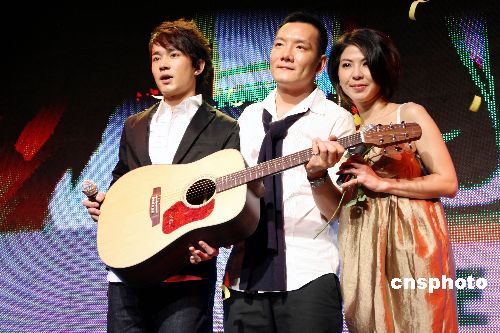 12月14日,許茹蕓《北緯66度》北京新聞發(fā)布會(huì)暨阿穆隆加盟種子記者會(huì)在北京舉行。經(jīng)過長達(dá)3年的沉淀與生活的歷練,許茹蕓帶著歌迷們的牽掛重新回到大家身邊。在發(fā)布會(huì)現(xiàn)場(chǎng),阿穆隆手持獻(xiàn)花與許茹蕓合唱《男人女人》。一曲唱畢,種子音樂總經(jīng)理田定豐先生走上臺(tái)來,贈(zèng)送阿穆隆一把精美的吉他,正式宣布阿穆隆簽約種子音樂。中新社發(fā) 袁方 攝