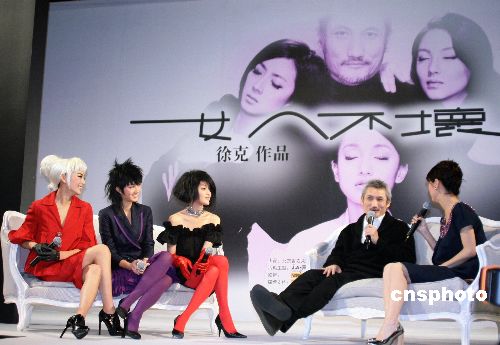 1月8日下午,由徐克指導(dǎo)的最新影片《女人不壞》在北京召開記者會,徐導(dǎo)率三位女主角周迅、桂綸鎂、張雨琦一同出席。三位女主角分別以極為“出位”的造型亮相,徐克稱不僅是從外形上對她們進行“改造”,還要讓這三位從沒演過喜劇角色的演員出演喜劇,挖掘出她們不為人知的一面。據(jù)悉,周迅在戲中要演包括孕婦、醫(yī)生、病人、記者、農(nóng)婦等十二個角色,桂綸鎂是一個相當(dāng)野蠻但是介乎于真實和虛幻里的人物,張雨琦則是綽號“無敵”的以智慧掛帥的女性。中新社發(fā) 一可 攝
