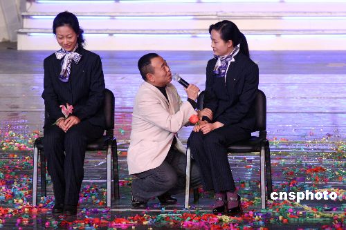 1月9日,2008年新春文藝晚會在河南藝術(shù)中心大劇院舉行,潘長江和在晚會現(xiàn)場找來的比自己小24歲的年輕媽媽以及一名20多歲的年輕媳婦作為搭檔共同表演小品《兩個對我恩重如山的女人》。中新社發(fā) 陳代述 攝