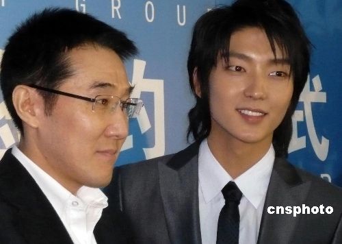 日前,韓國人氣偶像“李俊基”在愛浪(國際)文化產(chǎn)業(yè)集團(tuán)與韓國COMA公司北京舉行的締結(jié)聯(lián)盟簽字儀式上,正式提出自己中文名字為李準(zhǔn)基。 圖為韓國人氣偶像李準(zhǔn)基(右)與中國著名編劇作家海巖在發(fā)布會上接受采訪。