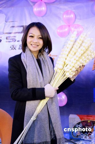 1月13日,有“臺(tái)灣電眼娃娃”之稱的歌壇小天后張韶涵,在北京為新專輯舉辦簽售活動(dòng)。有歌迷向她送上預(yù)祝專輯大賣的“麥穗”和象征奧運(yùn)的“福娃”。中新社發(fā) 一可 攝