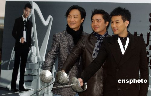 二月四日,香港歌星鄭中基(左)、梁漢文(右)與香港管弦樂團(港樂)第一副團長梁建楓,手持寶劍以“三劍俠”姿態(tài)宣布,三方將首度合作于二零零八年在紅館舉行三場演唱會。中新社發(fā) 蔡蔓莉 攝