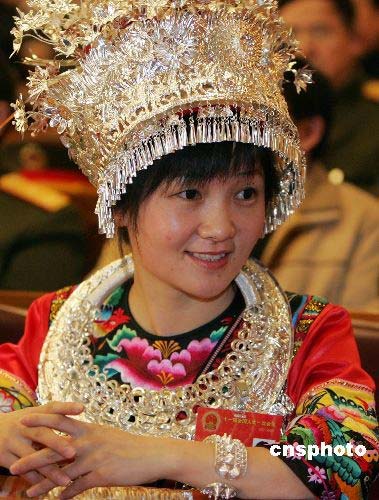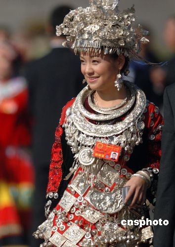 來自貴州的苗族全國人大代表雷阿幼朵,盛裝出席在北京人民大會堂舉行的十一屆全國人大一次會議預(yù)備會。中新社發(fā) 王東明 攝