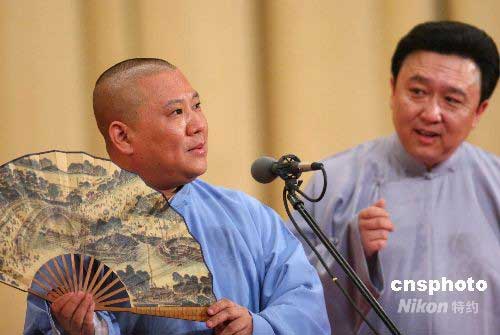 5月3日,紀(jì)念著名相聲大師侯寶林先生誕辰九十周年暨德云社相聲精品晚會,在北京人民大會堂舉行,當(dāng)紅相聲演員郭德綱率領(lǐng)德云社成員侯震、于謙、何云偉、曹云金、李菁等為觀眾獻(xiàn)上了一場精彩的演出。全場所有段落都是在侯寶林先生原作的基礎(chǔ)上稍加修改而成,這其中包括了《賣布頭》、《戲曲與方言》、《歪批三國》等經(jīng)典段子。中新社發(fā) 富田 攝