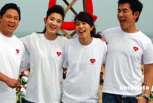 圖為兩岸三地歌手任賢齊、莫文蔚、劉一禎和澤旺多吉穿著印有一顆紅心的文化衫參加拍攝活動。