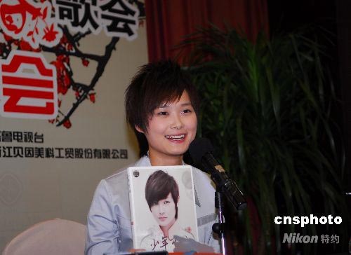 2008年7月13日,歌手李宇春做客山東,參加齊魯電視臺(tái)《粉絲大派送》,會(huì)見龐大的“玉米”歌迷,并為她的迷你新專輯《少年中國(guó)》做宣傳。中新社發(fā) 崔鵬森 攝