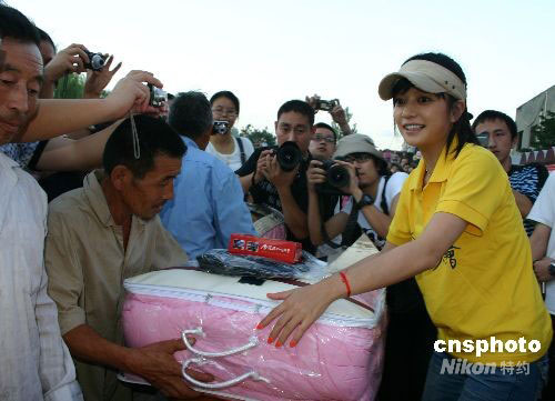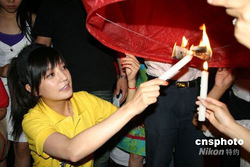 9月10日,由香港華光功德會(huì)組織的“情系四川——中秋月餅暖萬(wàn)心慰問(wèn)活動(dòng)”在綿陽(yáng)拉開(kāi)序幕,當(dāng)晚,影視明星趙薇在與災(zāi)區(qū)學(xué)生歡聚的中秋晚會(huì)上,點(diǎn)燃孔明燈,為四川祈福。中新社發(fā) 霍潺 攝
