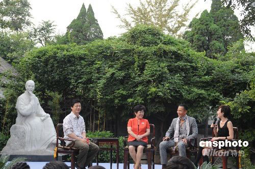 9月16日,《畫皮》主要演職人員周迅、陳坤、孫儷、戚玉武來到聊齋故里山東省淄博市淄川區(qū)蒲家莊,舉行《畫皮》全球首映式!懂嬈ぁ分黝}曲《畫心》的演唱者張靚穎也在現(xiàn)場傾情演繹了這一蕩氣回腸的歌曲。下午4點,著名主持人崔永元和《電影傳奇》節(jié)目還專門在蒲松齡故居進行了專訪,蒲學(xué)研究專家馬瑞芳現(xiàn)場進行點評。淄博是歷史名著《聊齋志異》作者蒲松齡的故鄉(xiāng),《畫皮》是其代表作。經(jīng)過長達一年的籌備與拍攝,東方新魔幻巨制《畫皮》將于9月26日與全國觀眾見面。中新社發(fā) 閆盛霆 攝