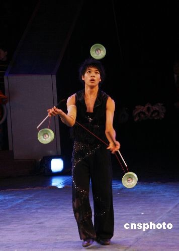 圖為來(lái)自中華臺(tái)北演員的表演《空竹》。第八屆中國(guó)武漢光谷國(guó)際雜技藝術(shù)10月25日在湖北武漢雜技廳開幕。本屆雜技節(jié)內(nèi)容包含雜技藝術(shù)的地面雜技、空中雜技、魔術(shù)、滑稽、馴獸五大類,可謂文武兼?zhèn)洹⒕始姵。中新社發(fā) 張 暢 攝