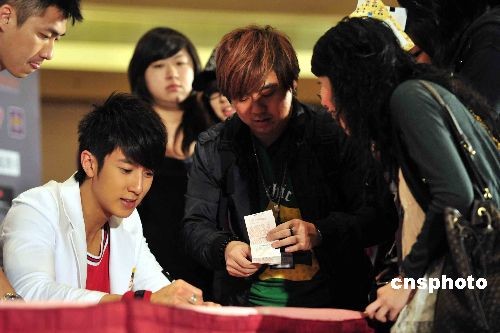 二月二十六日,臺灣組合“飛輪!痹谙愀垡簧虉雠e行簽名活動,為其即將舉行的演唱會造勢。中新社發(fā) 譚達明 攝
