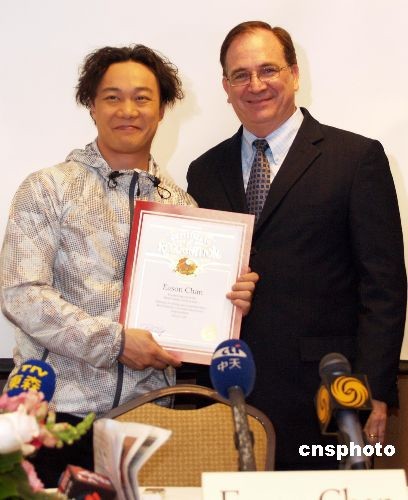 當?shù)貢r間3月19日,香港歌星陳奕迅飛抵美國洛杉磯參加世界巡回演唱會,受到加州眾議員夏樂柏頒獎歡迎。 中新社發(fā) 盧威 攝