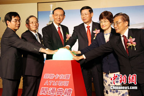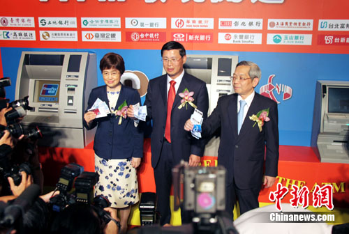 中新網(wǎng)臺北6月30日電(記者 黃少華)6月30日,中國銀聯(lián)、臺灣財(cái)金公司、臺灣銀行公會舉行記者會,宣布銀聯(lián)卡在臺ATM提領(lǐng)新臺幣、預(yù)借現(xiàn)金及余額查詢服務(wù)正式開通。