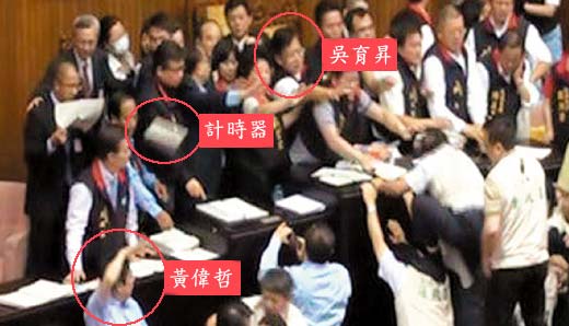 中新網(wǎng)7月9日電 據(jù)臺(tái)灣“中廣新聞”報(bào)道,8日在臺(tái)“立法院”臨時(shí)會(huì)中,兩黨再爆沖突,過(guò)程中民進(jìn)黨“立委”黃偉哲“勾射”計(jì)時(shí)器砸傷國(guó)民黨“立委”吳育升,為此,國(guó)民黨團(tuán)9日再次召開(kāi)記者會(huì)痛批,要平日自稱理性問(wèn)政的黃偉哲,拿下偽君子的假面具,民進(jìn)黨政策會(huì)執(zhí)行長(zhǎng)柯建銘則說(shuō),黃偉哲的動(dòng)作是綠營(yíng)的一大敗筆。此外,稱重砸傷吳育升的計(jì)時(shí)器,達(dá)1.1公斤。
