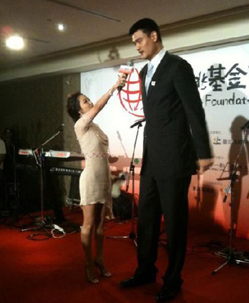 照片中的侯佩岑穿上高跟鞋,手伸的很長才訪問得到姚明,雖然舉話筒采訪很辛苦,不過,侯佩岑對姚明的慈善之心贊賞有加,直言“善良熱心的他實在是個真誠有禮又謙和的大男孩!”。
