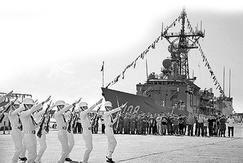 臺(tái)軍中年頭最久的傳統(tǒng)莫過(guò)于“海龍王大典”。據(jù)臺(tái)媒報(bào)道,臺(tái)海軍的敦睦遠(yuǎn)航支隊(duì)每年要穿越赤道一次,所有艦艇一字排開,橫著穿過(guò)赤道。同時(shí)艦艇上的汽笛拉響一分鐘,艦尾則噴水柱以示慶祝。除值班官兵外,所有人都要到甲板集合,舉行 “海龍王大典”。儀式由支隊(duì)長(zhǎng)或艦長(zhǎng)主持,他們帶頭焚香禱告并獻(xiàn)上牲果祭拜,祈求上天保佑航行平安。接著,甲板上會(huì)出現(xiàn)由海軍官校學(xué)生扮演的“海龍王” 和“蝦兵蟹將”。他們身穿龍王服、手持龍王杖、頭戴龍王面具,煞有介事地“出巡”,隨后向全艦官兵宣讀“圣旨”,同意艦艇通過(guò)赤道線。“海龍王”還會(huì)頒發(fā)“過(guò)赤道證書”,由艦長(zhǎng)恭敬接過(guò)。