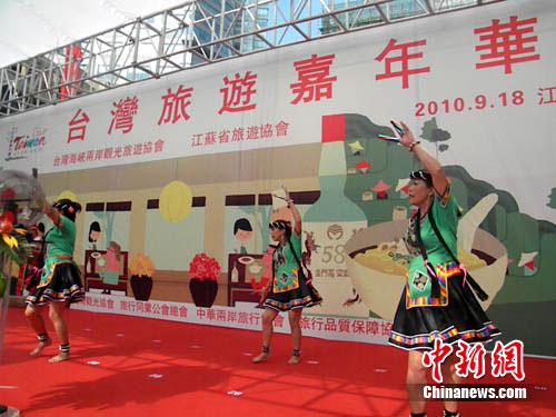 中新網(wǎng)南京9月18日電(記者 唐娟)18日,臺灣海峽兩岸觀光旅游協(xié)會(簡稱臺旅會)在南京舉行“臺灣旅游嘉年華”。這是臺旅會在大陸首度舉辦的戶外嘉年華推廣活動。在此間上午的嘉年華盛會上,臺灣藝術(shù)家們熱情火辣的原住民歌舞表演,將現(xiàn)場氣氛推至高潮。