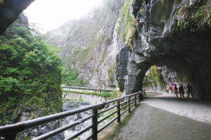 從燕子口往西,進(jìn)入太魯閣的迎賓峽,為中橫公路中最險(xiǎn)峻的地段———錐鹿隧道。這里是馳名世界的大理石斷崖,高達(dá)1660米,下臨深淵,名曰“錐鹿大斷崖”,工程人員沿溪在崖縫中鑿出凹槽,將公路嵌鑲在巖石峭壁上,險(xiǎn)峻無(wú)比。