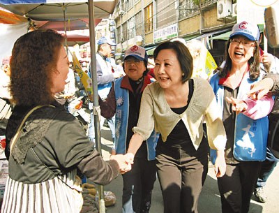 而在選情激烈的臺(tái)北市,國民黨候選人郝龍斌的太太高閬仙就與丈夫兵分兩路,高閬仙在“立法院長”王金平陪同下到街市拉票,不過似乎被王金平搶盡風(fēng)頭。