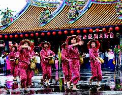 雖然下著大雨,但客家鄉(xiāng)親熱情依舊,個(gè)個(gè)打上客家花布領(lǐng)巾,組成客家味十足的踩街隊(duì)伍,由縣長領(lǐng)軍,從冬山鄉(xiāng)街道開始踩街至大興振安宮。