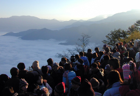 雖然寒流來襲,阿里山的最低溫只有攝氏二度,但大批游客仍摸黑起大早,將祝山觀日平臺(tái)擠得水泄不通。
