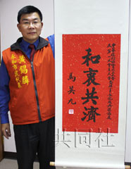 黃錫麟高舉馬英九贈給“中華保釣協(xié)會”的題詞。