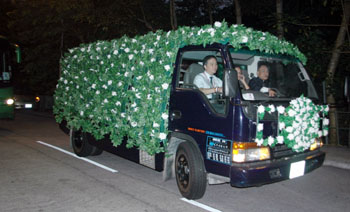 位于貨運(yùn)園區(qū)旁的簡(jiǎn)易靈堂以竹林為視覺(jué)擺設(shè),中堂擺設(shè)上近兩千盆白色蘭花,象征陳啟禮生前與“竹聯(lián)幫”的深厚淵源,而靈堂內(nèi)也有數(shù)百人出入穿梭。
