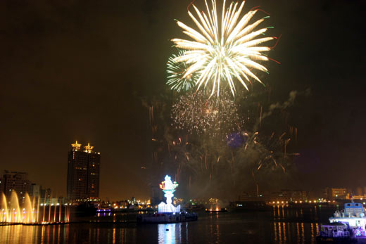 設(shè)在高港光榮碼頭海域的主燈,搭配煙花水舞,璀璨繽紛。(圖:臺(tái)灣《聯(lián)合報(bào)》)