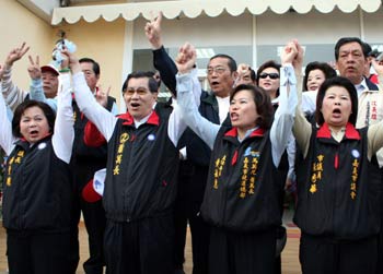 國民黨“副總統(tǒng)”候選人蕭萬長(右一)21日上午回故鄉(xiāng)嘉義市進行車隊掃街拜票,呼吁鄉(xiāng)親要“家己人要挺嘉義人”,讓馬蕭過關(guān)。