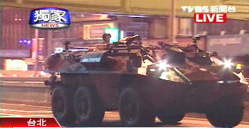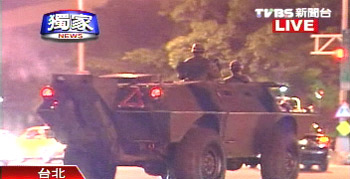 據(jù)臺灣 TVBS報(bào)道,凌晨零時三十分左右,四輛裝甲車開上臺北街頭,憲兵跟警車一路跟隨。隊(duì)伍從中華路一路轉(zhuǎn)進(jìn)中山北路,再到憲兵司令部,整個兵推過程歷時十五分鐘。