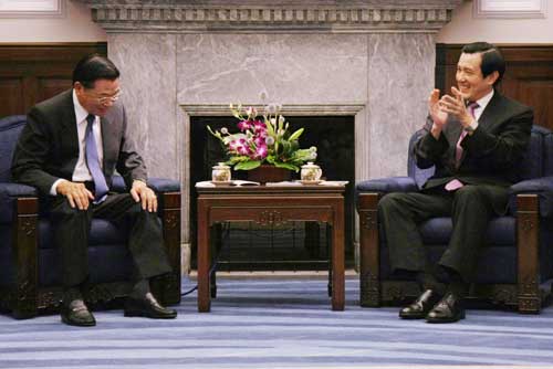 馬英九(右)六月九日接見;鶗(huì)董事長江丙坤等即將前往大陸協(xié)商的代表團(tuán)成員。(“中央社”圖)