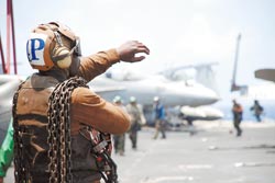其中身穿黃色制服的是導(dǎo)引官和督導(dǎo)官,負(fù)責(zé)戰(zhàn)機(jī)彈射前的定位和引導(dǎo)工作,當(dāng)他蹲下用手?jǐn)[出向前沖的手勢,就代表戰(zhàn)機(jī)可以彈射升空﹔白色制服人員則是安全組,負(fù)責(zé)甲板上人員警戒和安全醫(yī)療﹔穿著綠色制服的是彈射組,負(fù)責(zé)將戰(zhàn)機(jī)前輪固定在航母彈射器上,以及恢復(fù)攔截索定位。