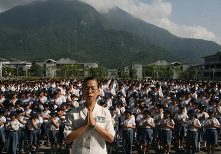 慈濟(jì)附中校長帶領(lǐng)千名師生,為川震死亡的師生祈福。