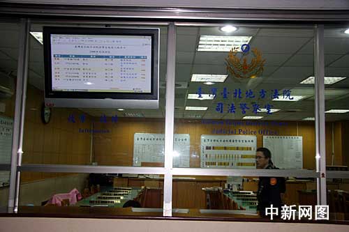 12月29日下午2時,臺北地方法院召開前臺灣地區(qū)領(lǐng)導人陳水扁羈押庭,經(jīng)過長達12多小時的庭訊、評議后,合議庭審判長蔡守訓30日2時25分裁定將陳水扁羈押,但不禁見。陳水扁被收押的公告就是在這里發(fā)布。 (中新社記者 陳立宇/攝)