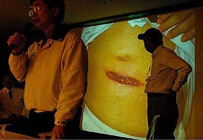 “總統(tǒng)府”發(fā)言人黃志芳(左)及奇美醫(yī)院院長詹啟賢(右)在記者會中向民眾說明病情。