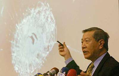 李昌鈺博士在離臺前的記者會上公布所采集的槍擊現(xiàn)場相關(guān)鑒識報告中指出:證據(jù)顯示陳水扁的傷口含有鉛微粒的成份及車窗的彈孔確實是從外向內(nèi)射擊造成的。