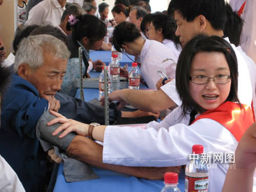 今日在六合區(qū)雄州市街道敬老院,長條課桌鋪開一溜,二十多個臺灣大學(xué)生著清一色白大褂,神情嚴(yán)肅認(rèn)真、儼然“大夫”模樣。在敬老院七十五個老人面前,他們詢病問傷,量血壓、針灸、開藥方,忙得不亦樂乎。