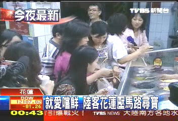 中新網(wǎng)6月18日電 據(jù)臺(tái)灣TVBS報(bào)道,大陸赴臺(tái)游踩線考察團(tuán)昨天晚上抵達(dá)花蓮,不顧先前勞頓,依舊精力旺盛,吃東西、買東西,對(duì)花蓮的名產(chǎn)樣樣覺(jué)得很新鮮;ㄉ彉I(yè)者半買半送,希望口碑能借由考察團(tuán)帶回大陸。