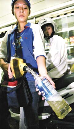 中新網(wǎng)10月31日電 臺灣島內(nèi)油價周五漲價,確定會漲到歷史新高,引發(fā)用油族的“囤油效應(yīng)”,不少人最近紛紛帶著瓶子上加油站,摩托車油箱加滿后再“加滿瓶”帶回家,高油價意外點(diǎn)燃“汽油炸彈滿街跑”的安全疑慮。