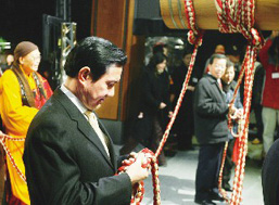 中新網(wǎng)2月9日電 綜合臺灣媒體報道,國民黨“大選”候選人馬英九在年除夕到法鼓山撞鐘,沒想到繩子竟然應(yīng)聲而斷,讓他非常尷尬,幸好搭檔蕭萬長趕緊解圍,把自己的繩子分了一半給馬英九拿。有人解讀這是觸霉運(yùn),不過馬英九自己的解讀是,他是在幫臺灣把厄運(yùn)甩掉。