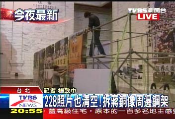 中新網(wǎng)4月3日電 據(jù)臺灣《聯(lián)合報》報道,臺北“中正紀(jì)念堂”蔣介石銅像今天將再“變身”。臺灣“二•二八”基金會昨天進(jìn)入銅像大廳重新布置,先拆除正中央的鋼架,并懸掛具政治宣傳意味的展品。