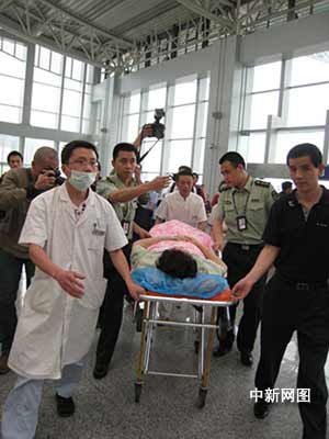 在汶川地震中受傷的臺胞韓聲璧20日下午搭乘臺灣華信航空公司的包機(jī)返回臺灣 民生提供