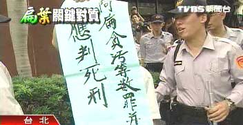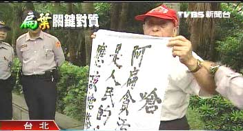 據(jù)臺灣TVBS報(bào)道,顧不得被大批警力包圍,有話要說的老伯伯努力甩開束縛,掙扎中,趁機(jī)秀出抗議陳水扁的海報(bào)?棺h老伯伯:“你看看應(yīng)該判死刑!對不對!”