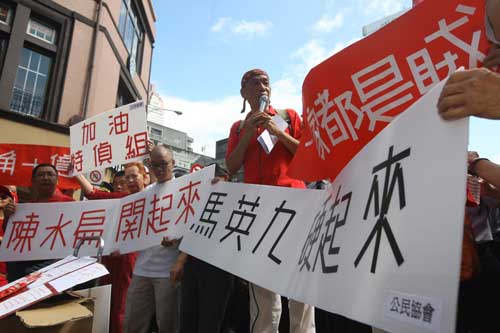 林正杰(右)十日帶領(lǐng)一群紅衫軍成員在臺“雙十”大會現(xiàn)場外圍,高舉標語海報,要馬英九硬起來,同時呼吁特偵組盡快將陳水扁抓起來。(“中央社”圖)