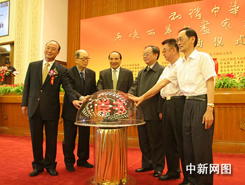 中新網(wǎng)北京6月9日電 (吉翔)為慶祝中華人民共和國成立60周年,進(jìn)一步推動(dòng)海峽兩岸文化交流與合作,“和諧中華·海峽兩岸書畫藝術(shù)家交流活動(dòng)”9日中午在北京人民大會(huì)堂啟動(dòng)。