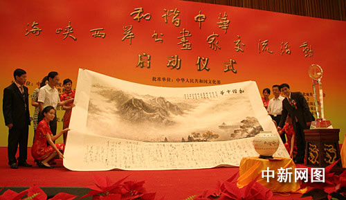 啟動(dòng)儀式上展出了15幅丈八巨幅書畫作品,全部是著名書畫家的新近之作。由兩岸眾多書畫家聯(lián)袂創(chuàng)作的丈二國畫《和諧頌》,集中展示了當(dāng)代書畫界的最高藝術(shù)成就。此幅畫作將作為特殊禮品贈(zèng)送給海峽交流基金會(huì)。