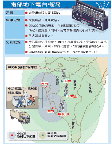 吳姓業(yè)者說(shuō),地下電臺(tái)發(fā)射塔多架設(shè)在高雄縣中寮山區(qū),這里有合法電臺(tái)發(fā)射塔,可利用合法掩護(hù)非法;其次高雄電信警察距中寮山約一個(gè)多小時(shí)車程,上山路況又不好,“執(zhí)法單位久久才會(huì)跑一趟”。
