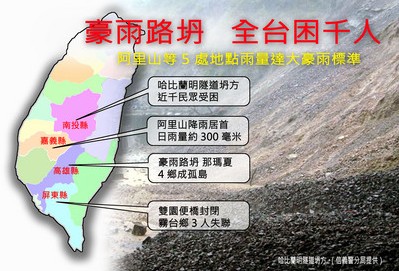 截至23日晚間9點(diǎn),全臺(tái)降雨前五名地區(qū)分別是阿里山287毫米、高雄縣桃源鄉(xiāng)御油山241毫米、南投信義鄉(xiāng)神木村218毫米、臺(tái)中縣和平鄉(xiāng)雪嶺211毫米、高雄縣桃源鄉(xiāng)溪南211毫米,都達(dá)到大暴雨標(biāo)準(zhǔn)(24小時(shí)累積雨量達(dá)200毫米以上)。
